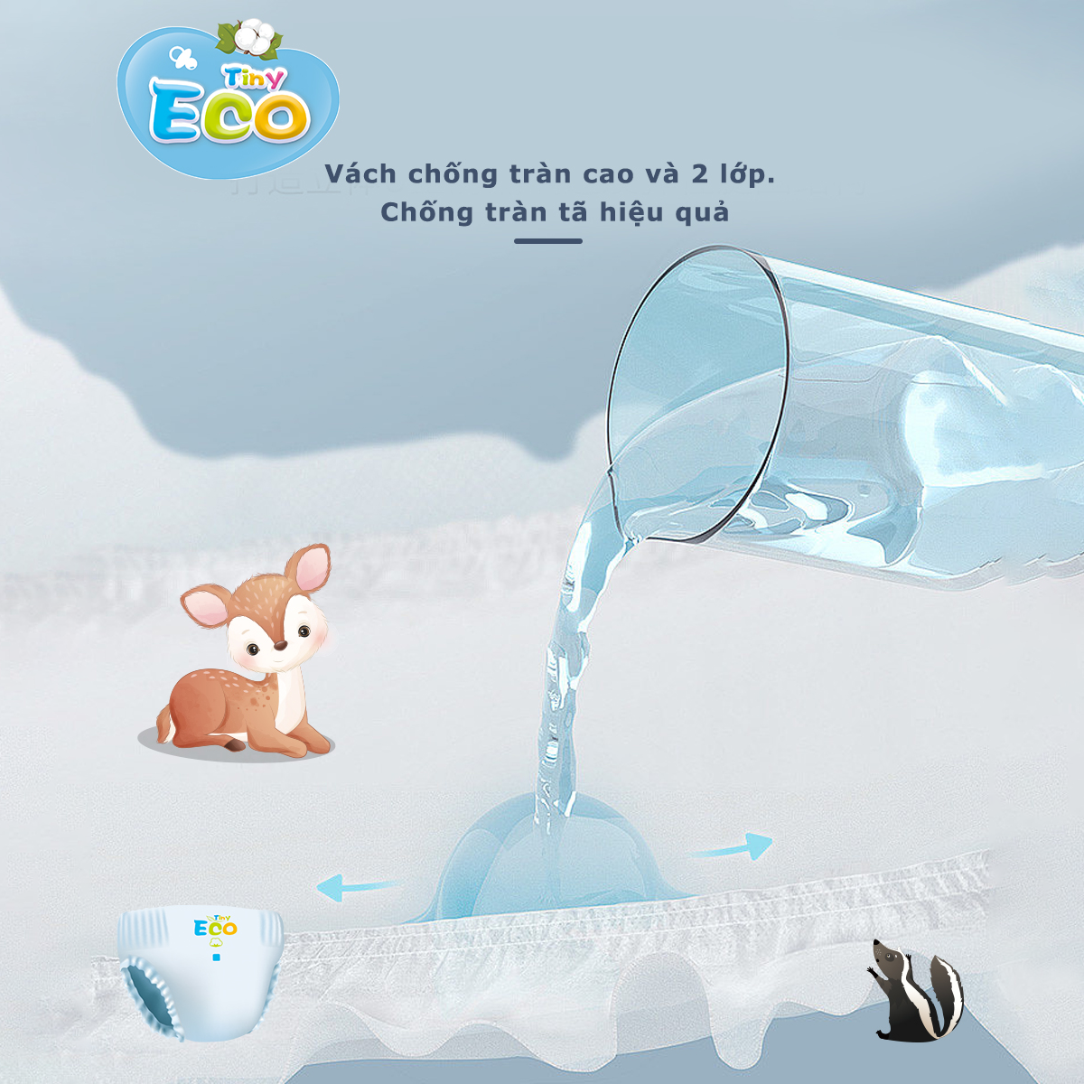 Một cải tiến nhỏ nhưng tạo ra được tính năng vượt trội trên sản phẩm bỉm Tiny Eco. Với thiết kế vách chống tràn kép và cao chống tràn cực kỳ hiệu quả, giúp bé thỏa sức vận động.